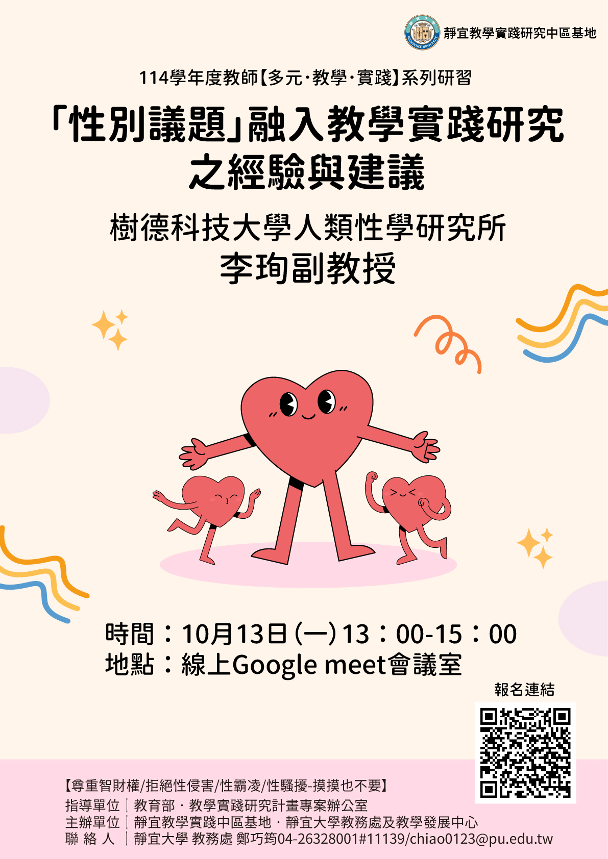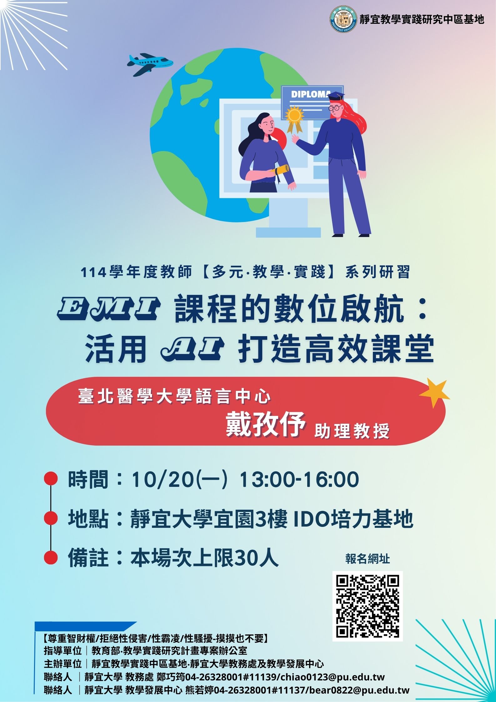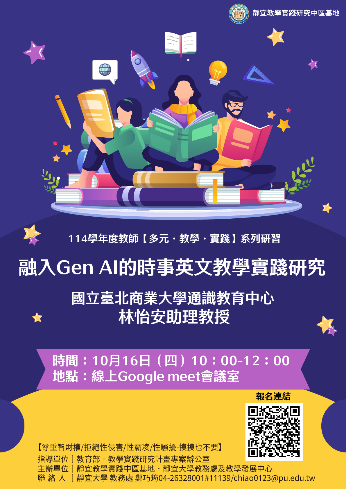 靜宜大學教學實踐研究計畫中部區域基地謹訂於114年10月辦理四場教師知能研習,敬邀貴校教師踴躍報名參加,並惠予公(差)假