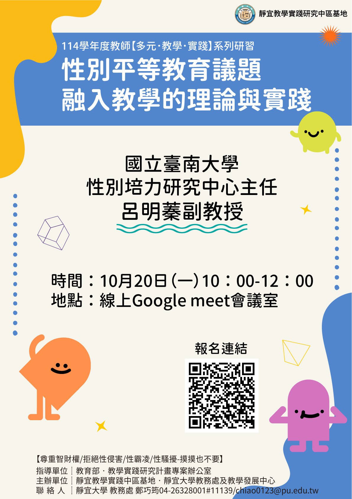 1、主題:「性別平等教育議題融入教學的理論與實踐」。