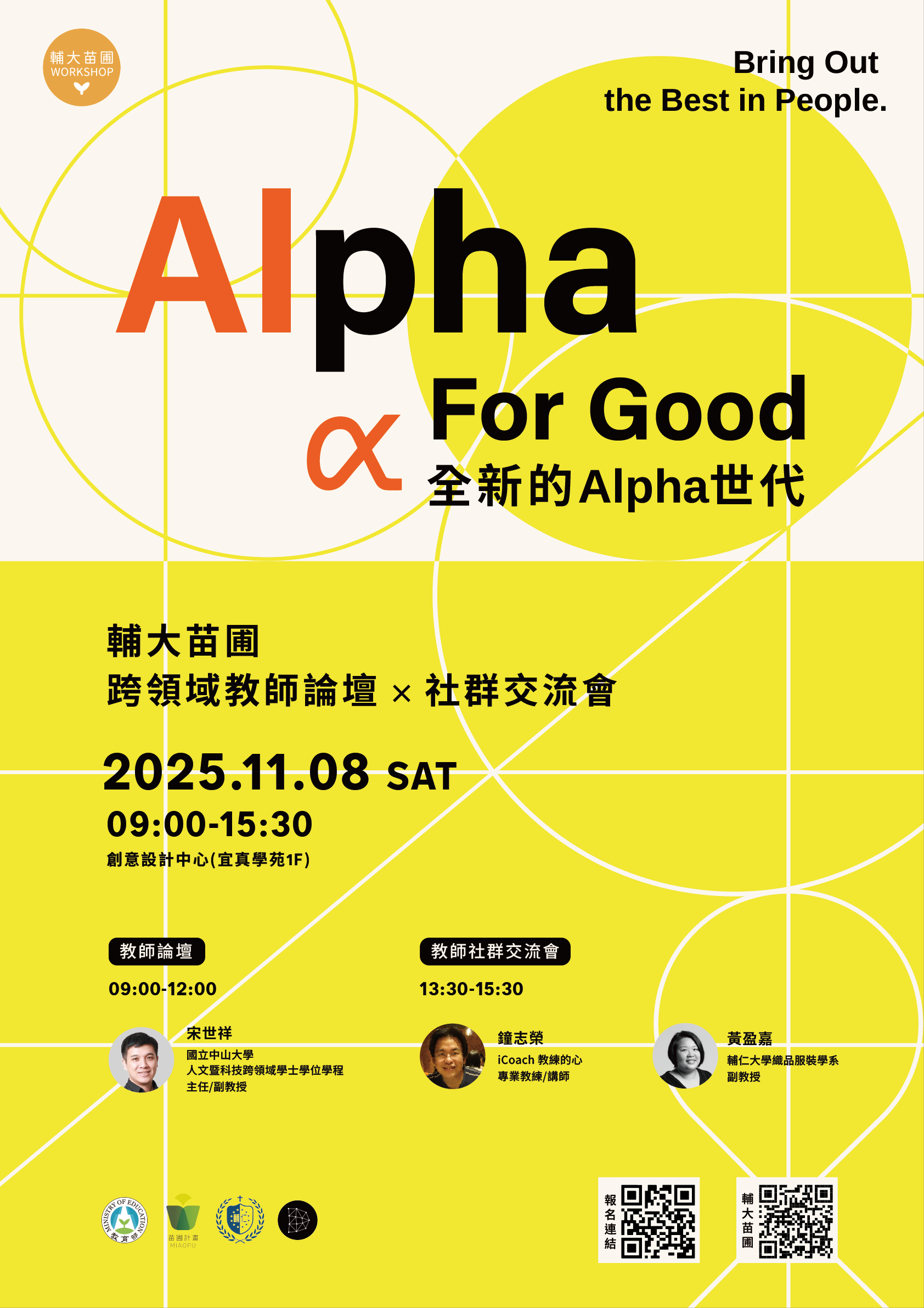 輔仁大學學校財團法人輔仁大學本校謹訂於114年11月8日舉辦教育部跨領域教師發展暨人才培育計畫輔大苗圃【Alpha For Good:全新的Alpha世代】跨領域教師論壇&社群交流會,敬邀貴校院教師踴躍參加