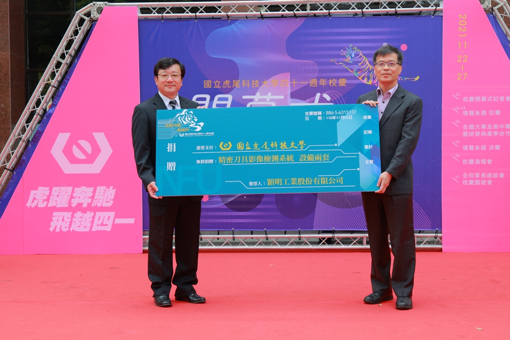 41週年校慶系列活動由11月22日(一)校慶開幕式記者會揭開序幕,由本校嘻哈研究社及炎藝火舞社學生演繹校園活力。自張信良校長上任以來,以攜手企業育才、共同成長為理念。持續強化與業界間的連結,挹注學習資源,共同培育優異產業技術人才。校慶當日,常陽興業股份有限公司林煜喆董事長和優適達科技股份有限公司林明慧執行長特地前來,捐贈新台幣伍佰萬元以及「精密軸件尺寸檢測系統」和「精密刀具影像檢測系統」新興產業設備,嘉惠虎科大學子,鍛鍊專業知能。虎科大將繼續藉由和產業界的密切合作,隨時掌握產業動向,讓學校這一座銜接學能與職能的橋樑更加穩固。