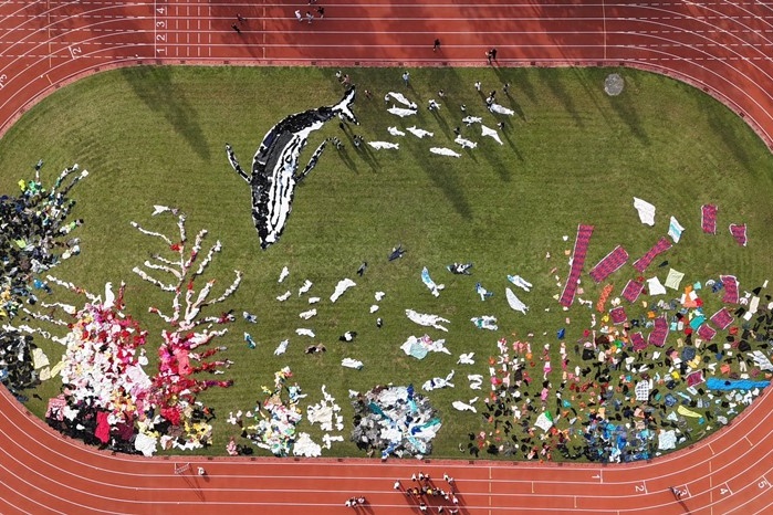 當天由藝術家吳成夫(小花)帶領雲林縣口湖鄉下崙國小學生,使用二手衣物創作「逐格動畫」完成大型地景藝術,並與社區⻑輩共同製作鯨⿂、章⿂、魟⿂等海洋⽣物完成,點亮「鯨豚共舞、永續海洋」的主題,彰顯青銀共創與社會共好的理念。