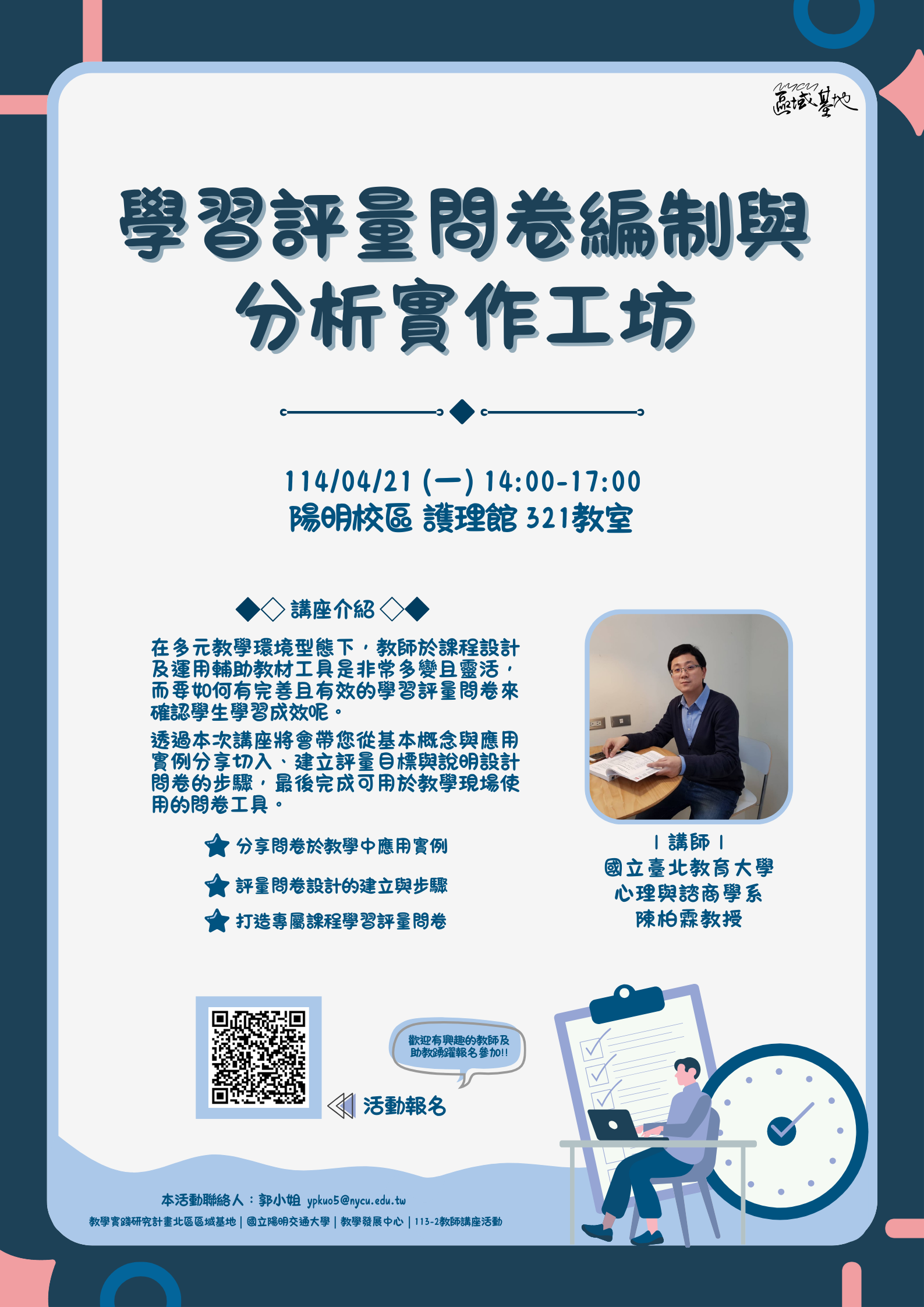 國立陽明交通大學辦理114年度教學實踐研究區域基地計畫「學習評量問卷編制與分析實作工坊」活動資訊