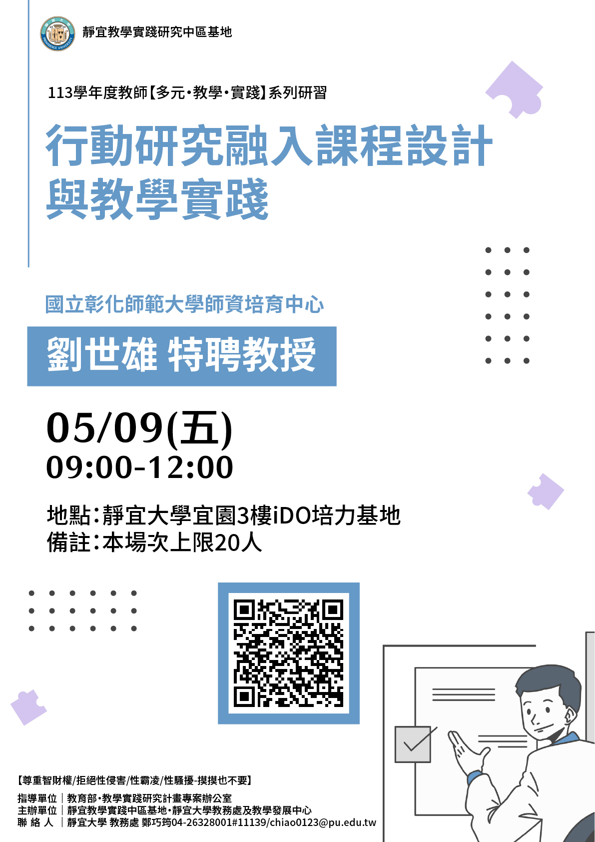 靜宜大學辦理教學實踐研究計畫中部區域基地謹訂於114年5月9日辦理 「行動研究融入課程設計與教學實踐工作坊」