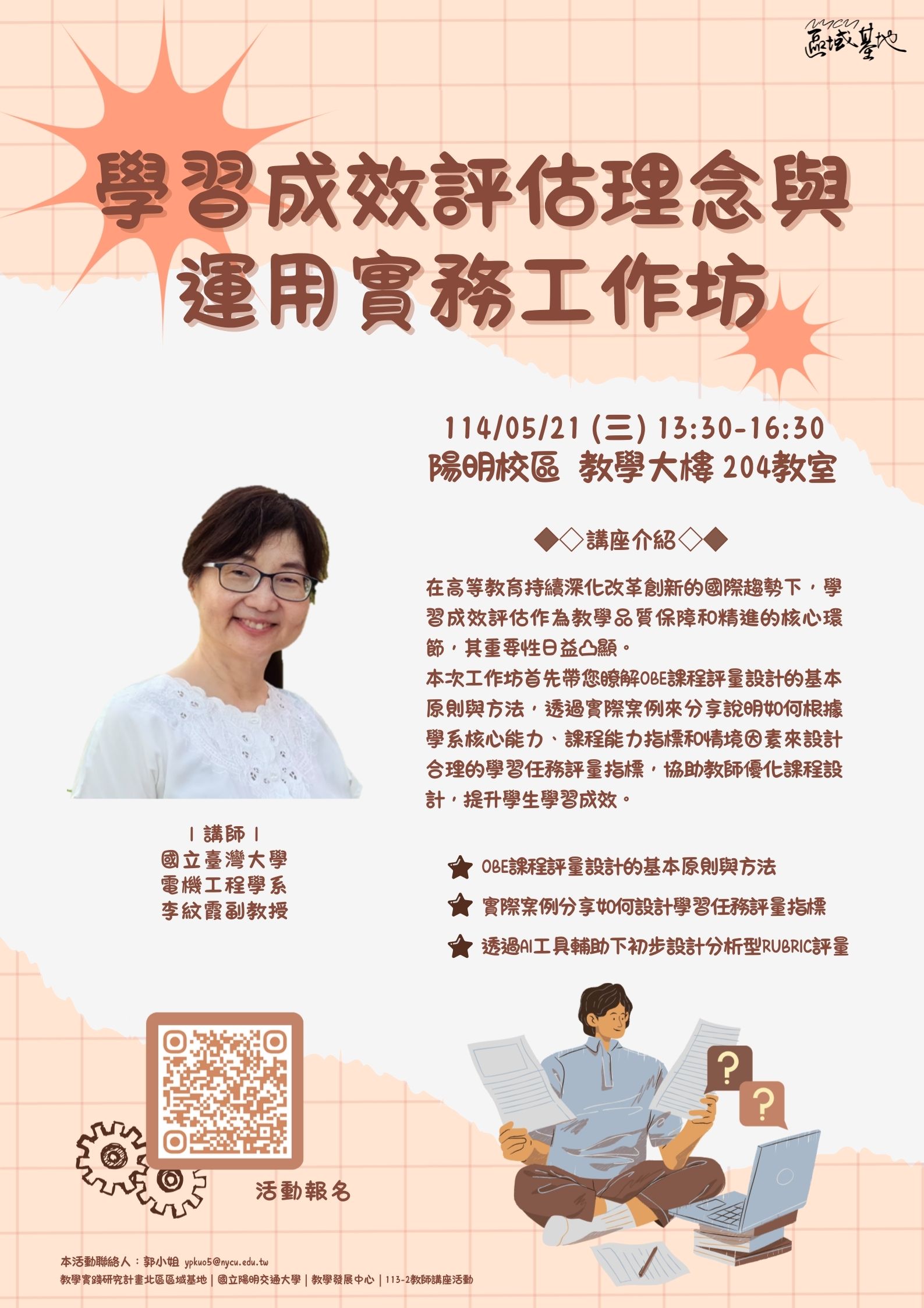 國立陽明交通大學辦理114年度教學實踐研究區域基地計畫「學習成效評估理念與運用實務工作坊」活動資訊