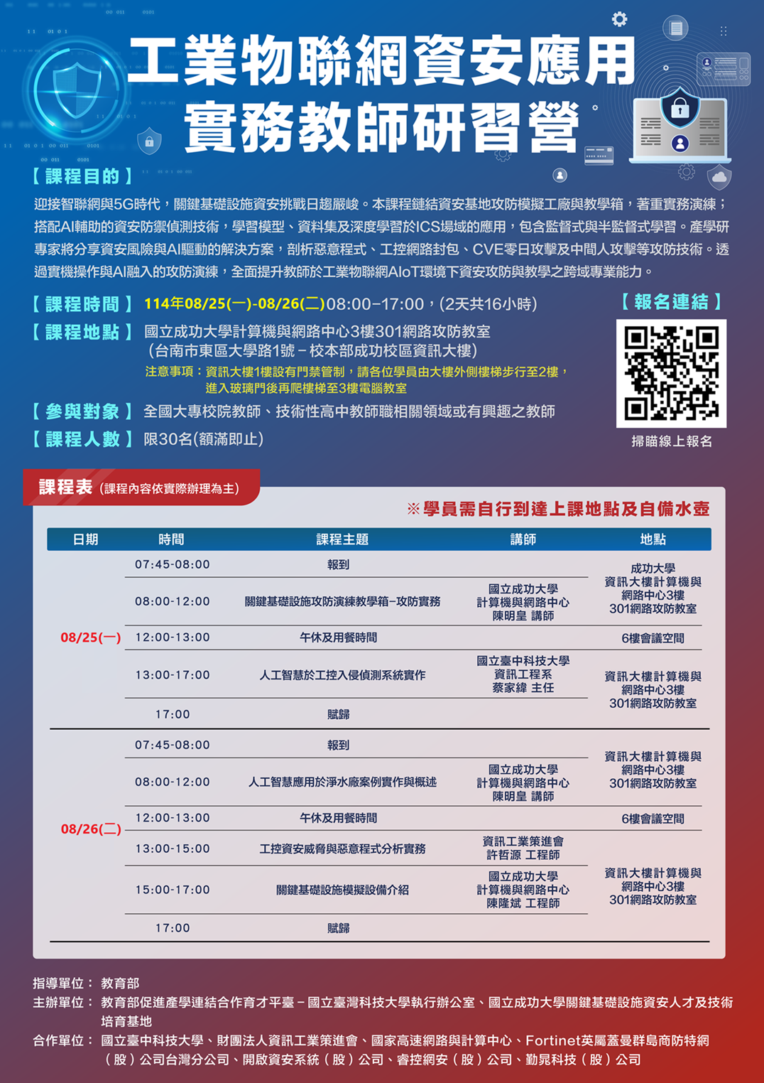 國立臺灣科技大學因颱風延期辦理「工業物聯網資安應用實務教師研習營」,時間調整至8月25日(一)及8月26日(二),敬邀教師踴躍報名參與
