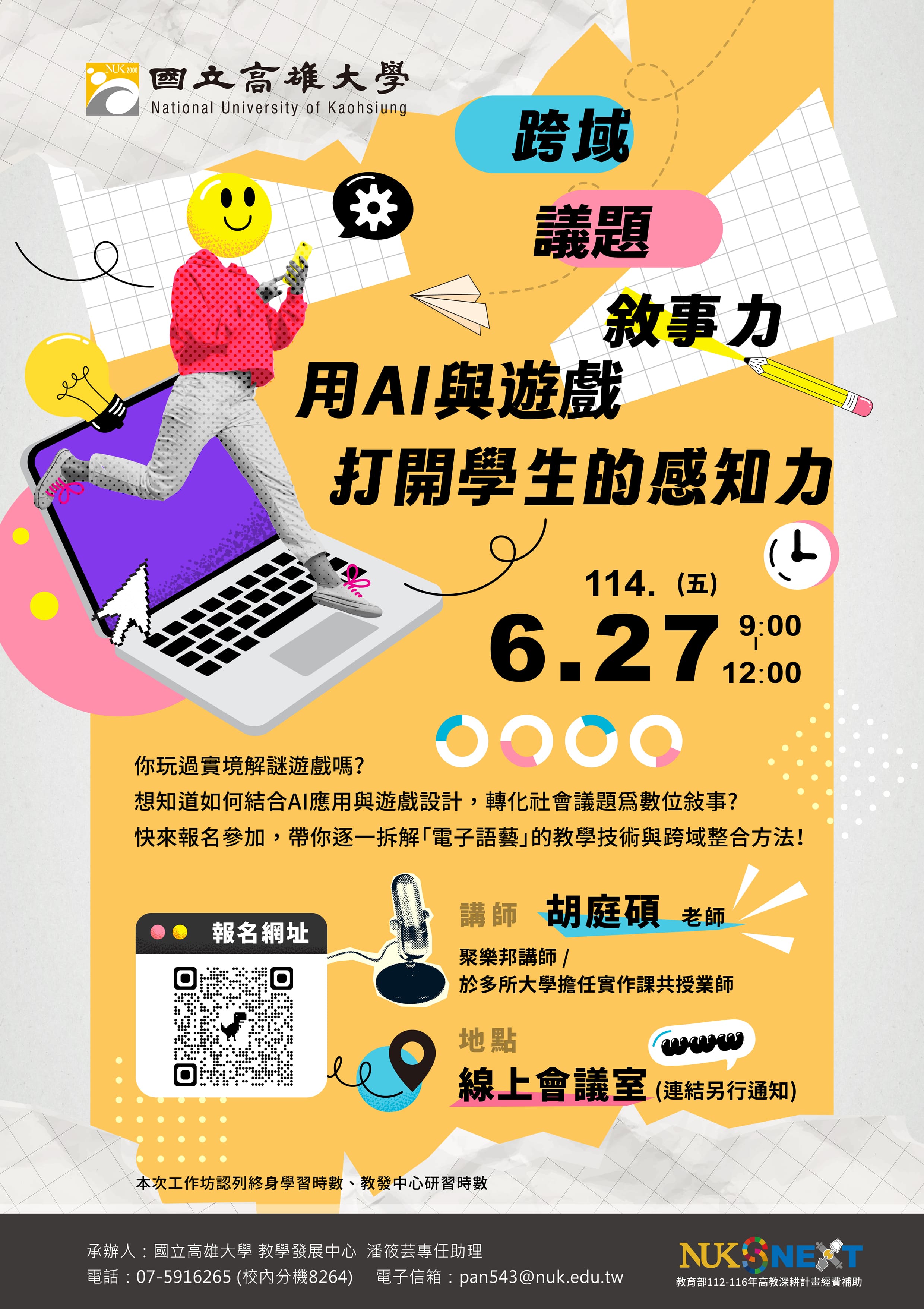 國立高雄大學辦理「跨域x議題x敘事力:用AI與遊戲打開學生的感知力」線上研習資訊