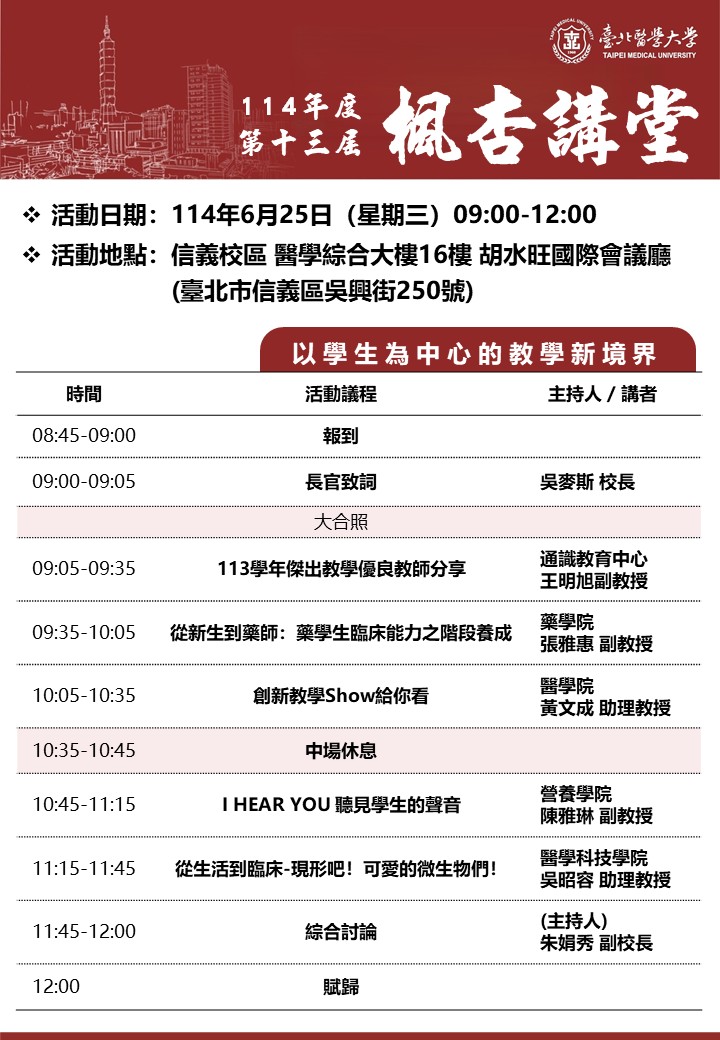 臺北醫學大學辦理114年度「第十三屆楓杏講堂」
