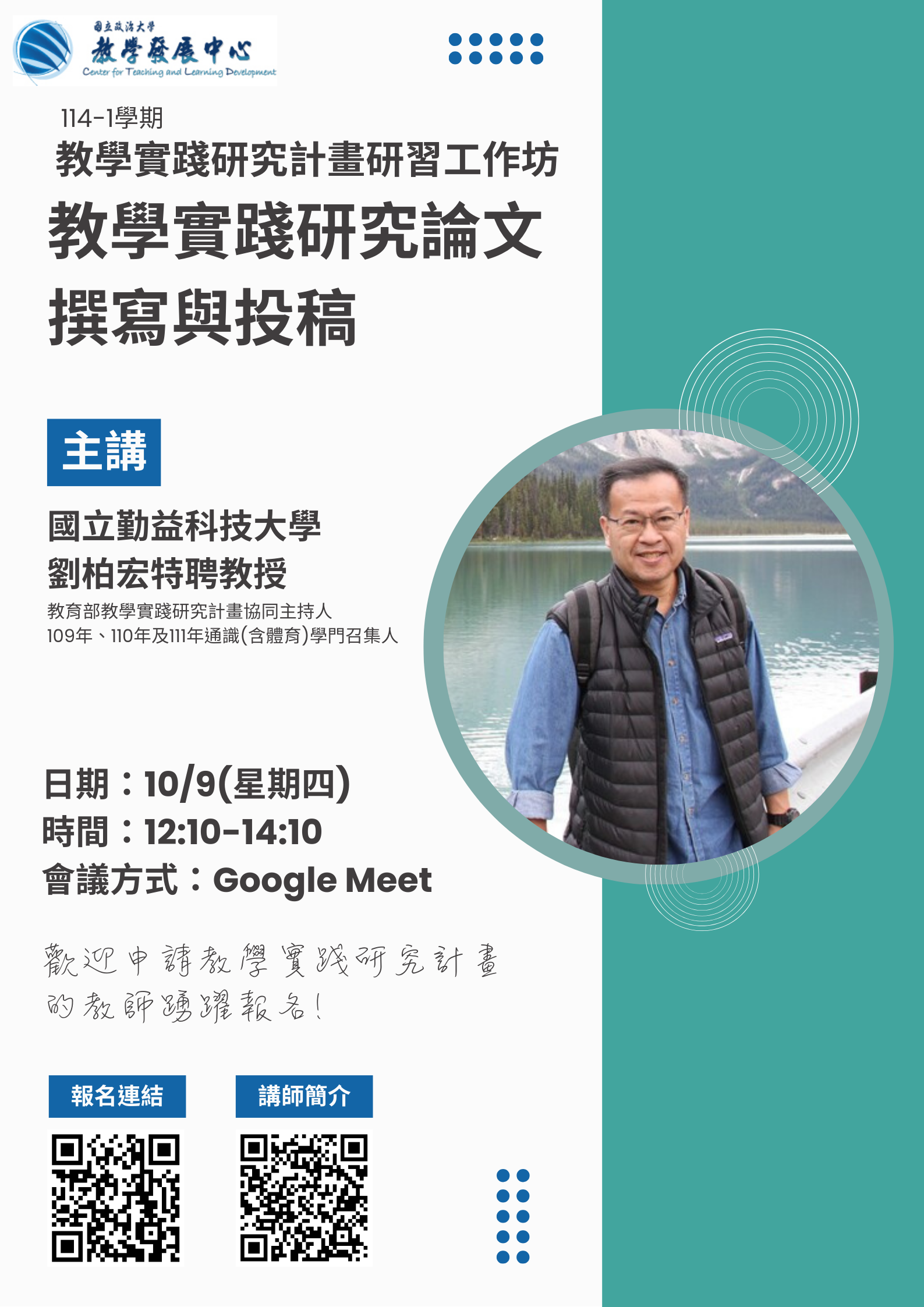 國立政治大學訂於114年10月9日(星期四)舉辦114學年第1學期教學實踐研究計畫工作坊「教學實踐研究計畫學術論文撰寫與投稿」,敬邀貴校教師踴躍參與