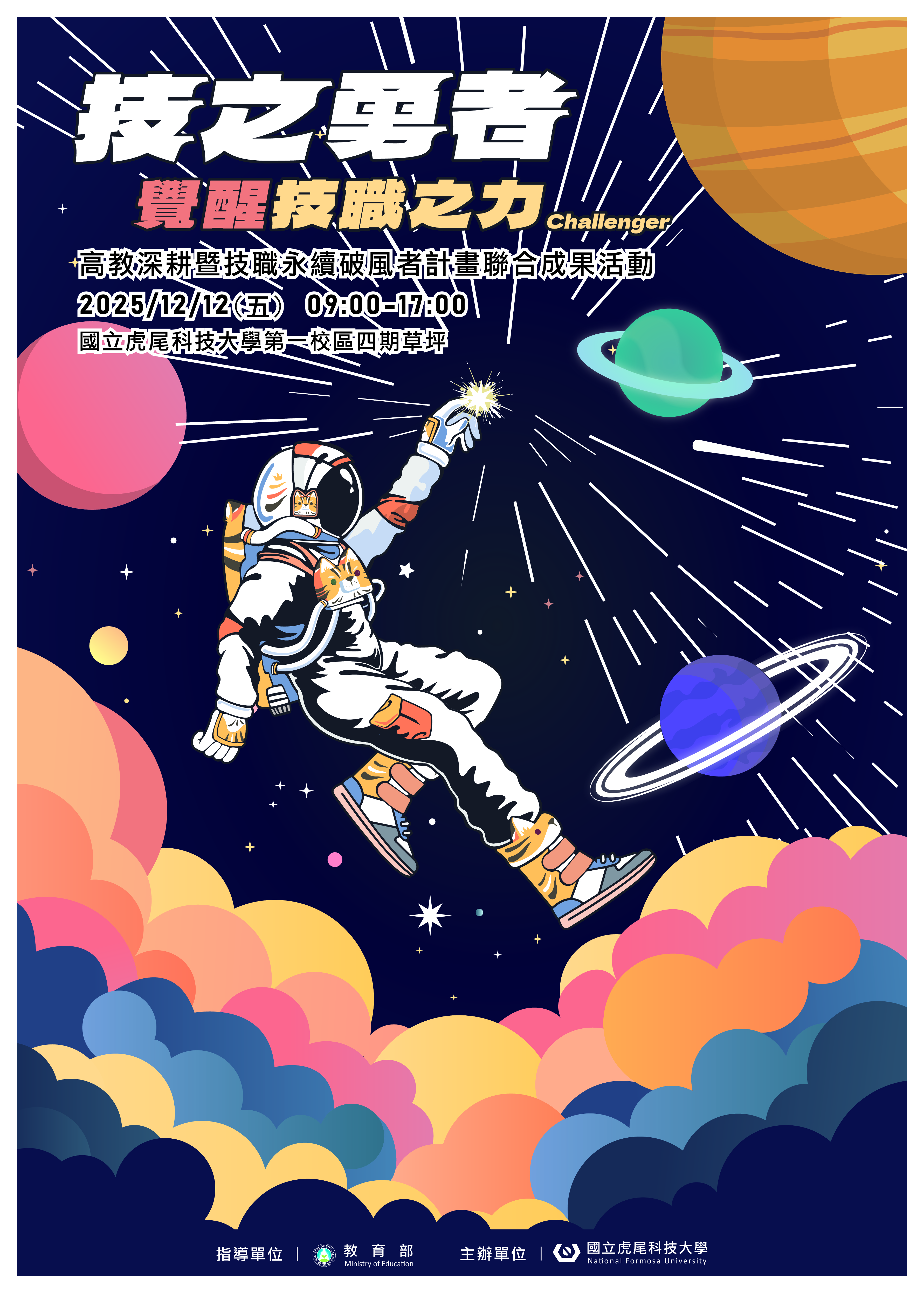 本校謹訂於114年12月12日(五)舉辦「技之勇者X覺醒技職之力」114年度高等教育深耕計畫成果展,敬邀全體教職員生踴躍參加。