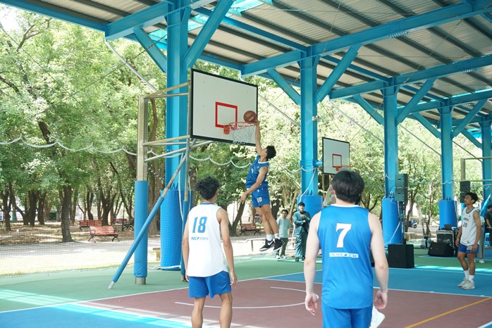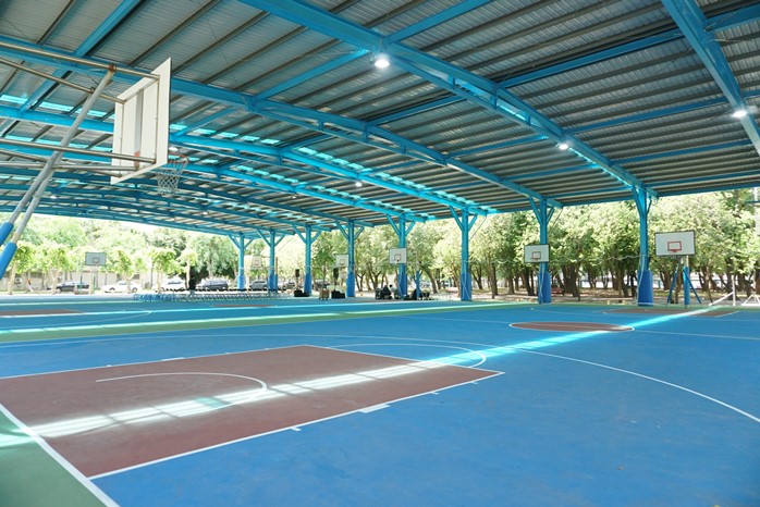 球場可供籃球與排球等運動項目使用,優化工程涵蓋球場鋪面更新、遮雨結構建置、節能照明。採鋼骨人字形屋架設計,打造中間無柱遮雨的開放空間,提升場地通透性與使用彈性,並具備良好的排水與防雨功能。