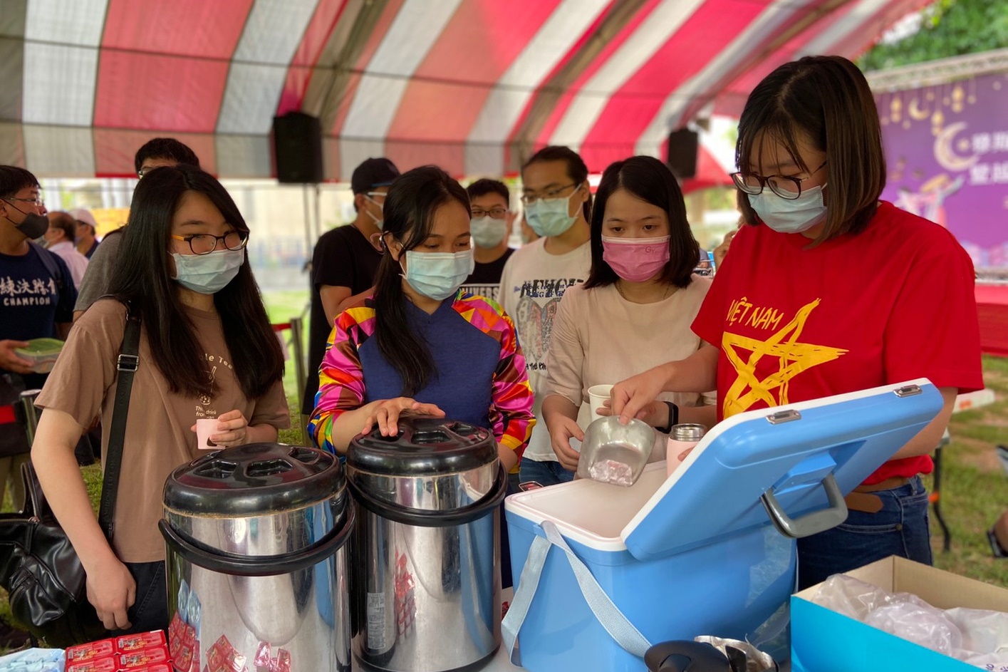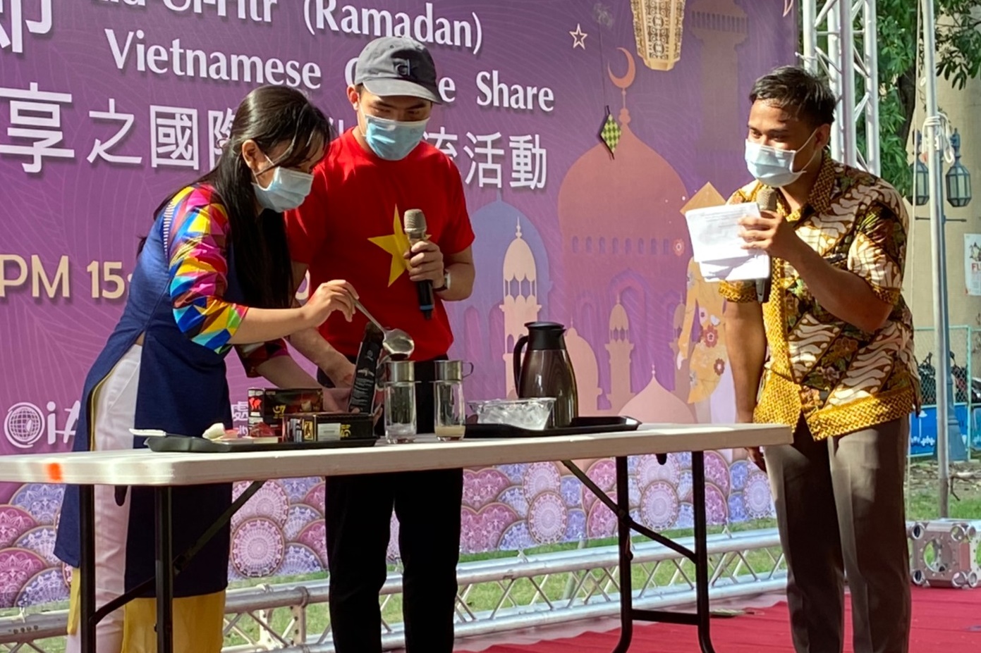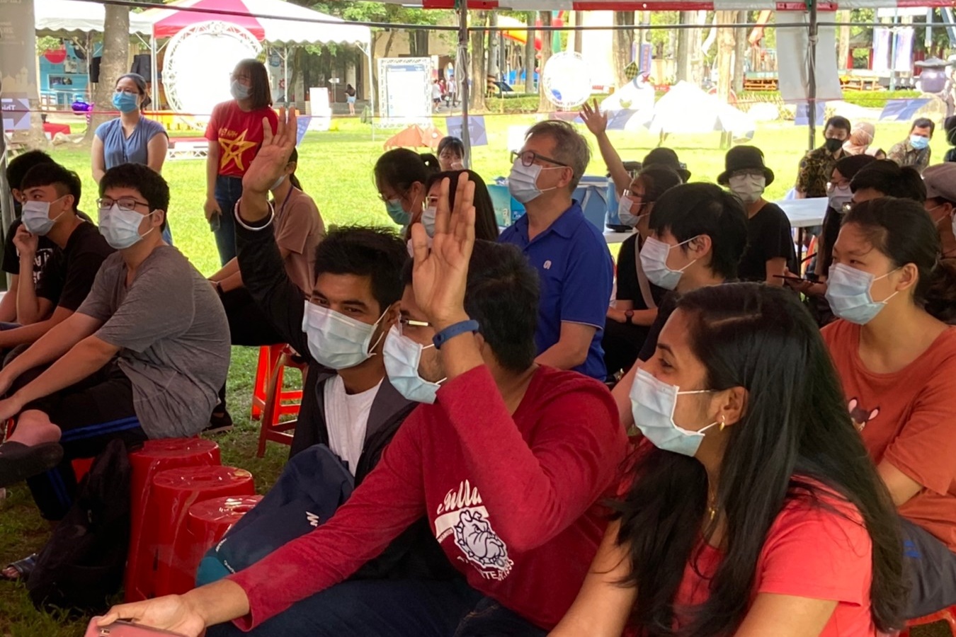 另外,此次活動中國際處亦邀請越南學生分享傳統越南咖啡的沖泡方式與特色,香濃的越南咖啡再加上印度及印尼的傳統餐點,讓整個活動盛宴增添了不少繽紛的國際色彩。而在歡慶活動之餘,疫情的防範亦未被輕忽,所有參與者及工作人員皆全程配戴口罩,活動會場的入口處也安排了工作人員為參與者量體溫並記錄,活動餐點也取消了以往大家一同用餐的安排,改為參與者自備餐盒外帶,以將群聚感染的風險減到最低。