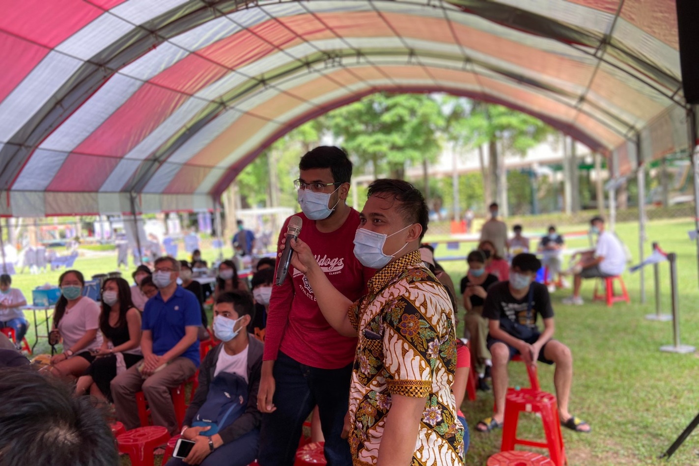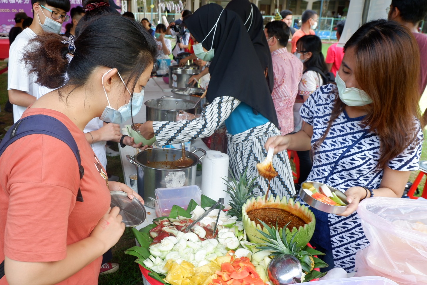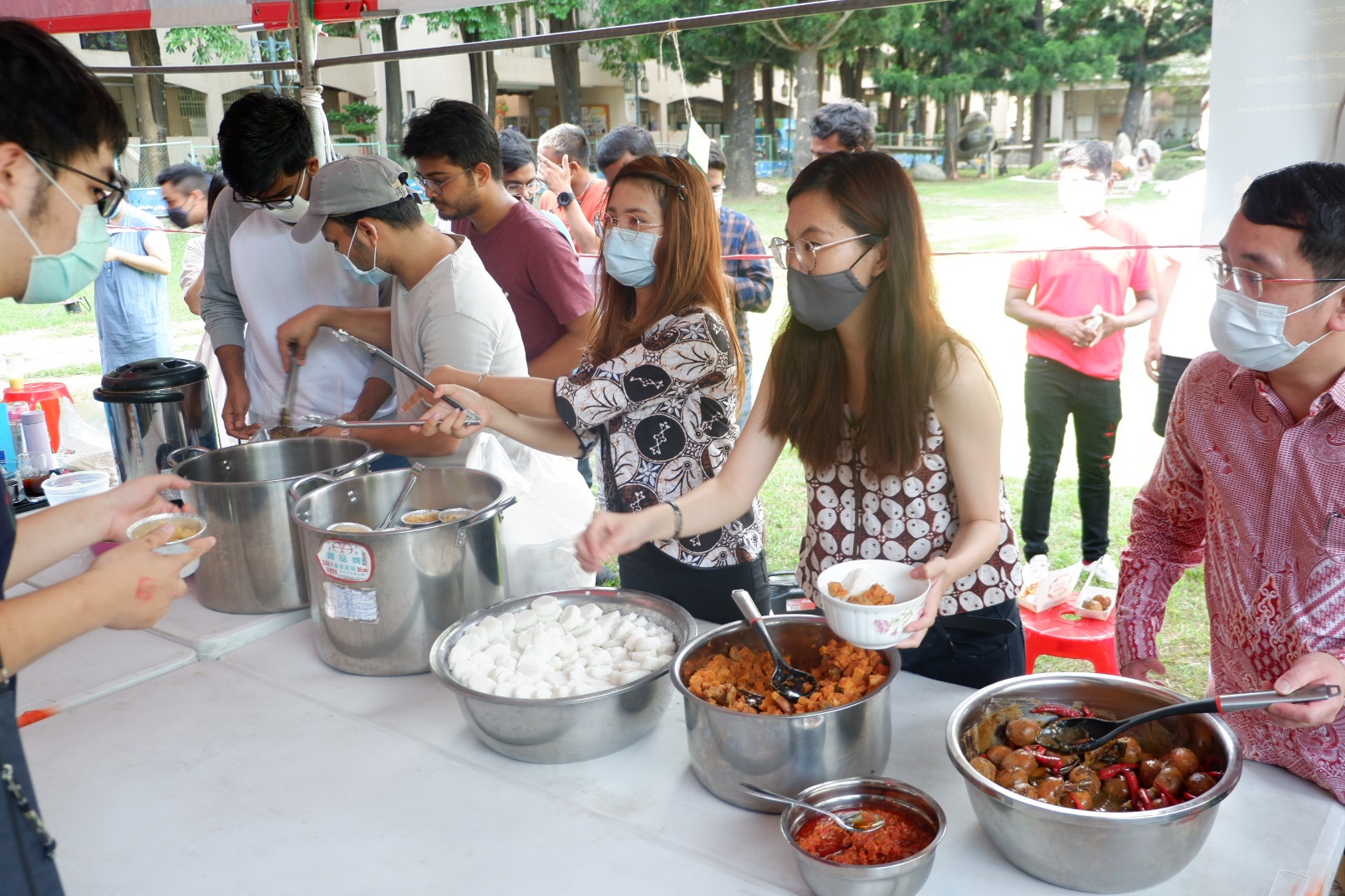 另外,此次活動中國際處亦邀請越南學生分享傳統越南咖啡的沖泡方式與特色,香濃的越南咖啡再加上印度及印尼的傳統餐點,讓整個活動盛宴增添了不少繽紛的國際色彩。而在歡慶活動之餘,疫情的防範亦未被輕忽,所有參與者及工作人員皆全程配戴口罩,活動會場的入口處也安排了工作人員為參與者量體溫並記錄,活動餐點也取消了以往大家一同用餐的安排,改為參與者自備餐盒外帶,以將群聚感染的風險減到最低。