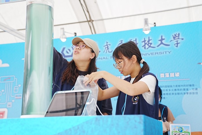 另也展現虎科大與在地政府攜手實施能效提升計畫,結合物聯網技術與社區參與,透過智慧能源管理系統與能源教育。現場也展出二氧化碳捕手「微藻固碳示範缸」,為虎科大建構智慧化氣候友善校園先導型計畫,並於校園建置微藻固碳示範基地,示範缸可讓民眾認識微藻的固碳能力與藻體多元應用價值,邀請民眾為永續未來同努力。