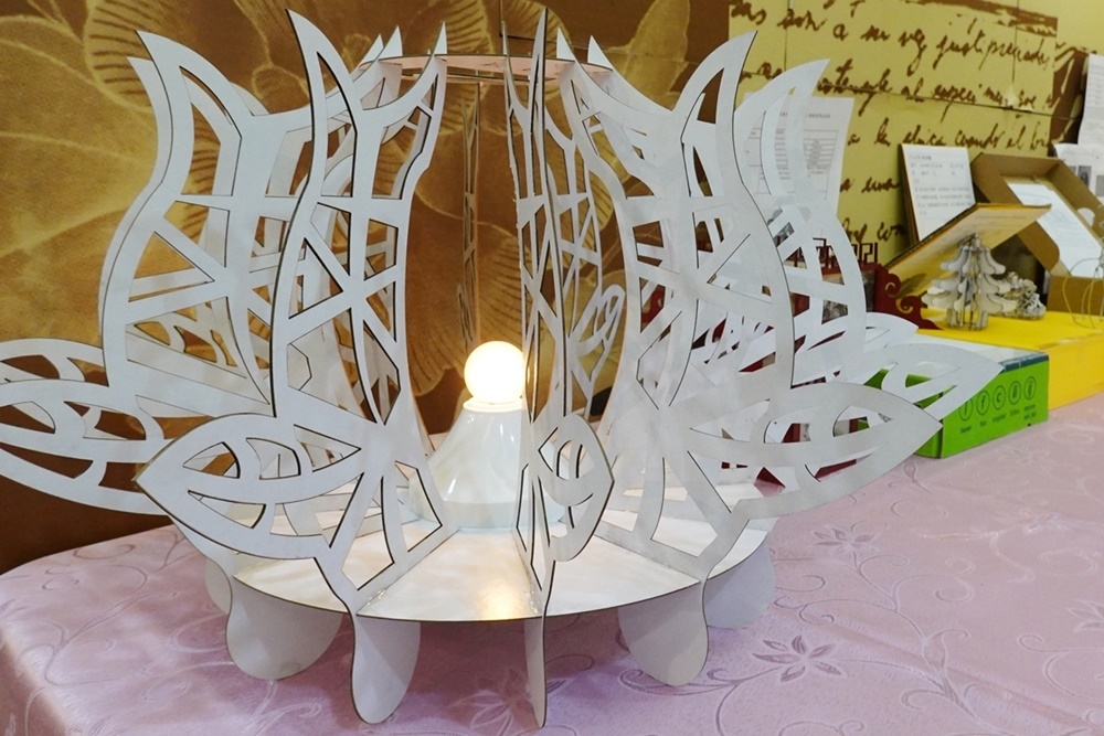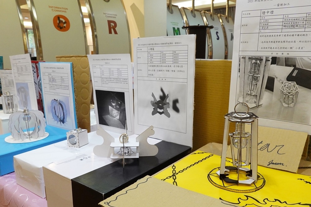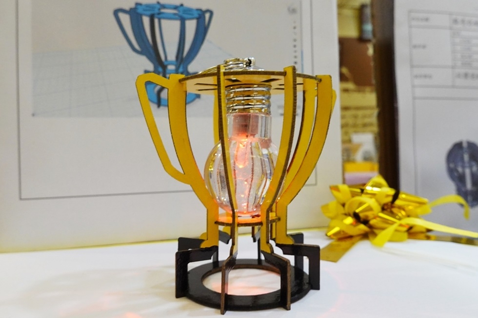 今年「科技與生活應用」通識教育課程的雷射加工單元,以燈具設計製作為主體,學生從學習加工知識、觀摩他人的優良作品開始,逐步設計出自己的作品。經由課堂上的自我導向學習、傾聽、小組討論後,由精通立體繪圖的學生,以服務學習的方式擔任小組長,指導其他組員學習立體繪圖及轉檔,再利用電腦3D繪圖設計及雷射加工機。創作出優良的藝術燈具作品。