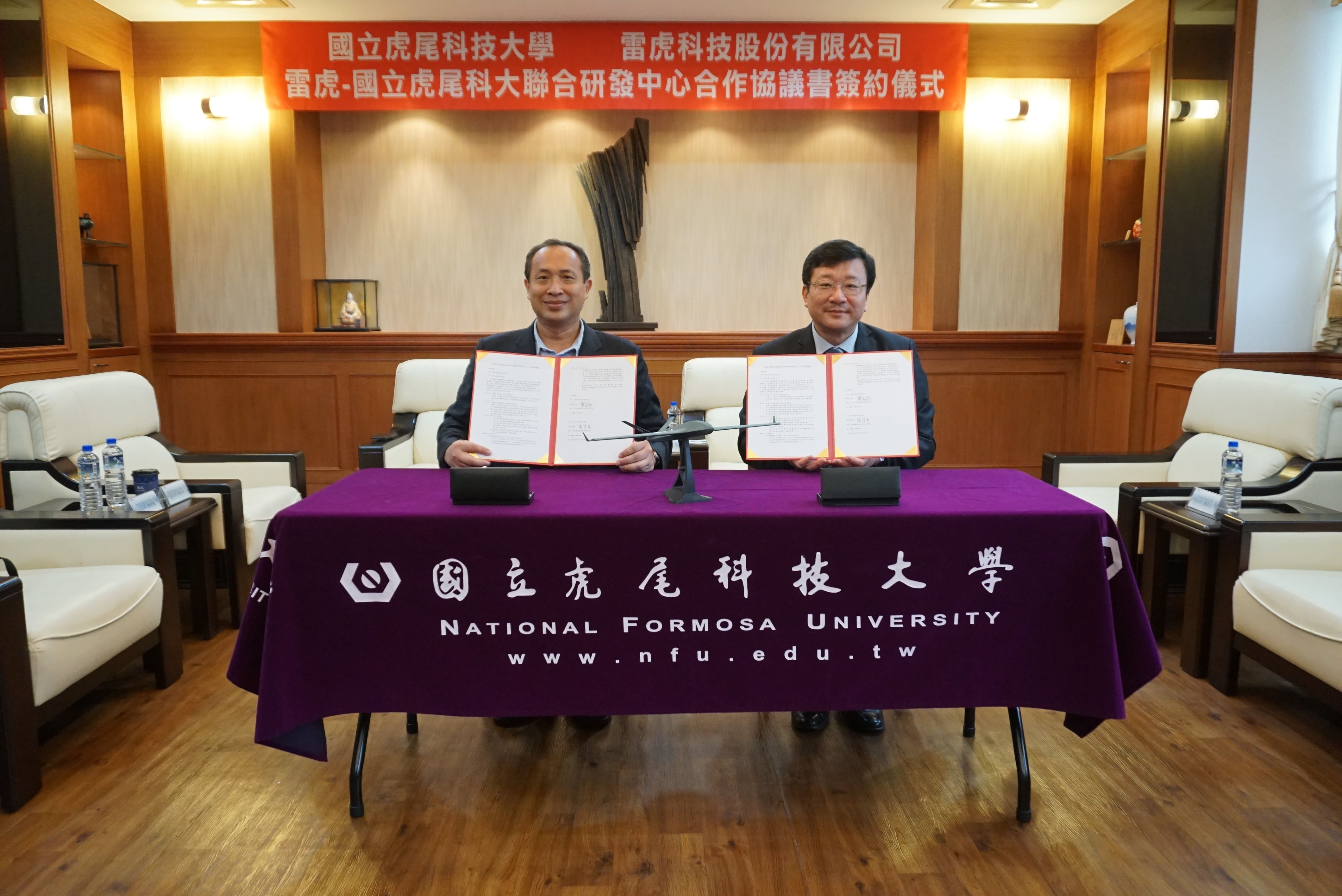 國立虎尾科技大學與雷虎科技股份有限公司宣布成立「雷虎-國立虎尾科技大學聯合研發中心」,並於10/4(三)由虎科大校長張信良與雷虎科技董事長陳冠如代表簽署協議,同時發表雙方合作開發的第一款固定翼無人機之原型機,搶攻國防產業並發展下一代航太複合材料,此為台灣第一個無人機領域的國立大學產學聯合研發中心。