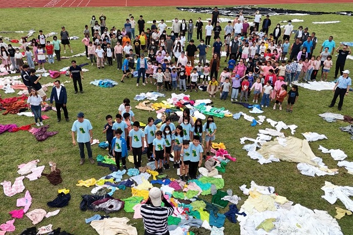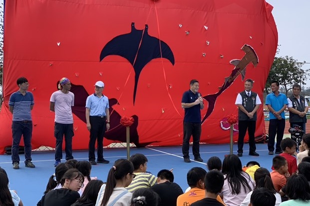 當天由藝術家吳成夫(小花)帶領雲林縣口湖鄉下崙國小學生,使用二手衣物創作「逐格動畫」完成大型地景藝術,並與社區⻑輩共同製作鯨⿂、章⿂、魟⿂等海洋⽣物完成,點亮「鯨豚共舞、永續海洋」的主題,彰顯青銀共創與社會共好的理念。