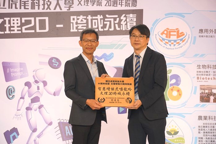 院慶儀式由文理學院院長彭及忠代表致贈「智慧增能 虎嘯龍吟 x 文理20 跨域永續」匾額予虎科大,由副校長方昭訓代表接受,象徵學院結合智慧教育、跨域學習與永續實踐三大面向推進教育、發展校務的承諾,同時也為虎科大44週年校慶增添意義非凡的紀念。