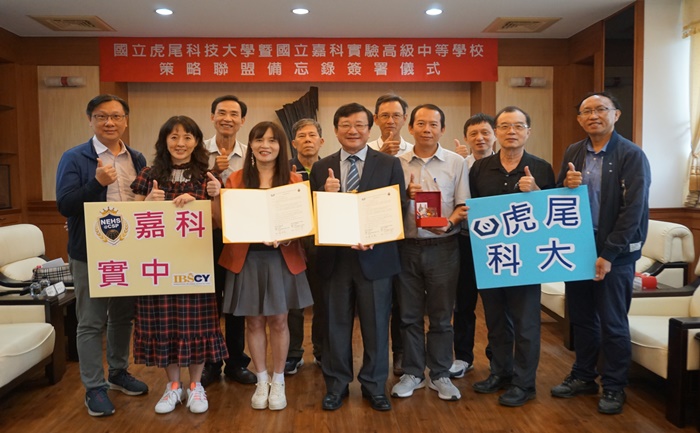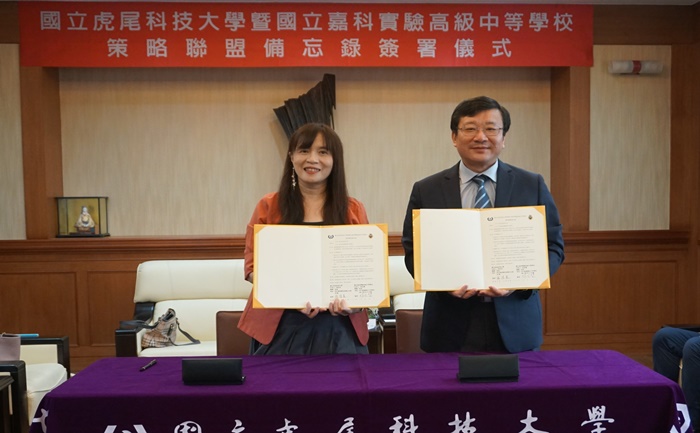 國立虎尾科技大學與國立嘉科實驗高級中等學校10/18(三)簽訂策略聯盟備忘錄,由虎科大校長張信良與嘉科實中校長林怡慧代表簽署。虎科大將為嘉科實中未來學生量身訂做基礎「無人機飛行操控與智慧應用課程」,並提供維運管理的「亞洲無人機AI創新應用研發中心」場域資源,促進教育資源互惠共享。
