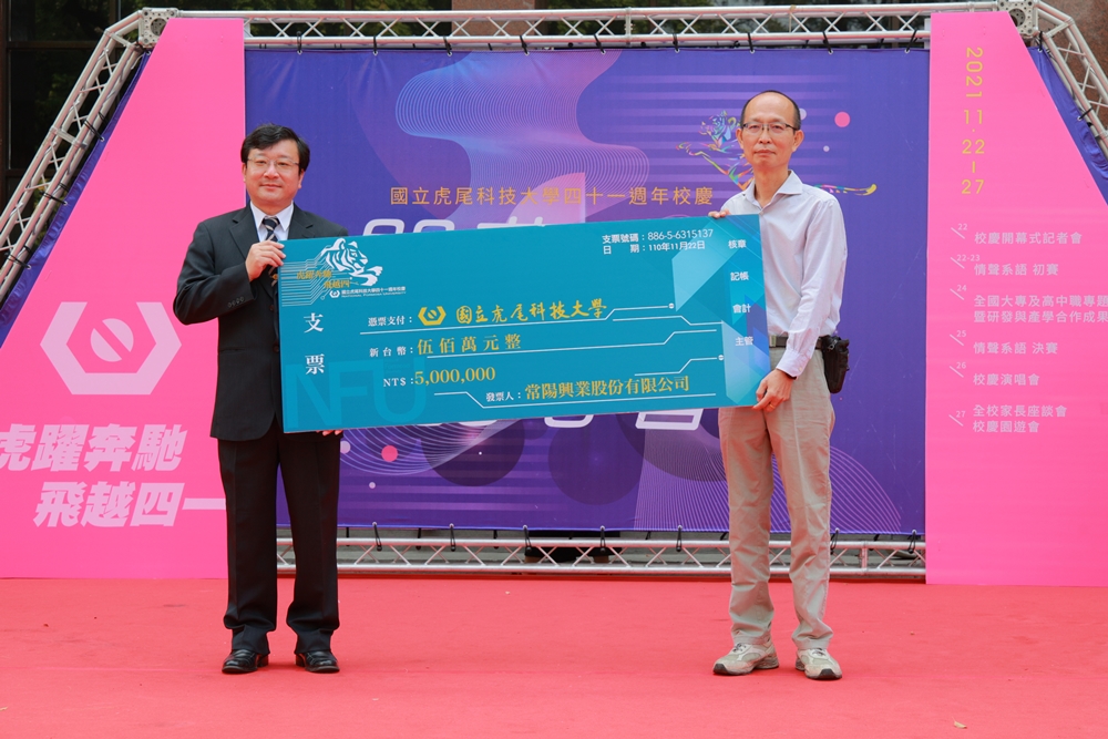 41週年校慶系列活動由11月22日(一)校慶開幕式記者會揭開序幕,由本校嘻哈研究社及炎藝火舞社學生演繹校園活力。自張信良校長上任以來,以攜手企業育才、共同成長為理念。持續強化與業界間的連結,挹注學習資源,共同培育優異產業技術人才。校慶當日,常陽興業股份有限公司林煜喆董事長和優適達科技股份有限公司林明慧執行長特地前來,捐贈新台幣伍佰萬元以及「精密軸件尺寸檢測系統」和「精密刀具影像檢測系統」新興產業設備,嘉惠虎科大學子,鍛鍊專業知能。虎科大將繼續藉由和產業界的密切合作,隨時掌握產業動向,讓學校這一座銜接學能與職能的橋樑更加穩固。