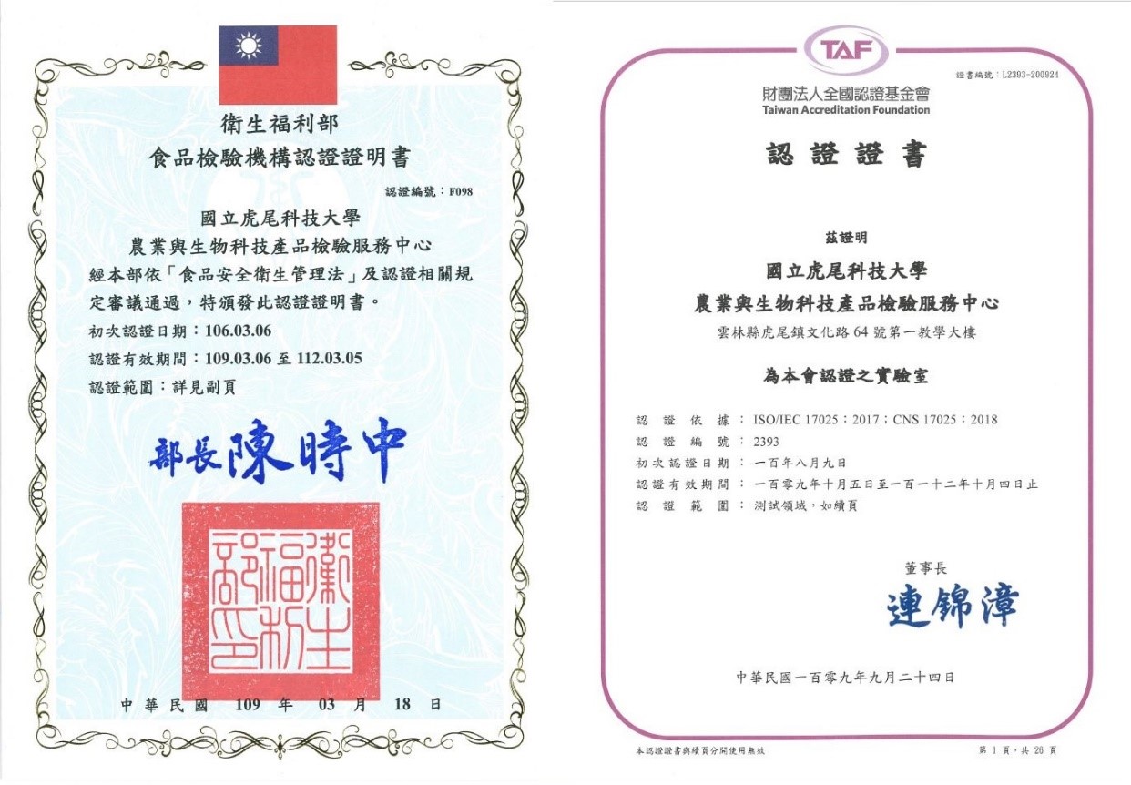 本校農業與生物科技產品檢驗服務中心近期已先後獲得衛生福利部食品藥物管理署(TFDA)及財團法人全國認證基金會(TAF)雙認證,藉由與國際接軌之檢驗機構認證制度,提升本中心之技術能力與品質,期能提供客戶兼具正確性與公信力之檢驗報告,善盡為廣大農業民生消費食品安全把關之責。目前可因應客戶需求,依據公告方法提供多重農藥殘留之分析服務。如有相關需求,歡迎隨時與本校檢驗中心05-6312381洽詢。