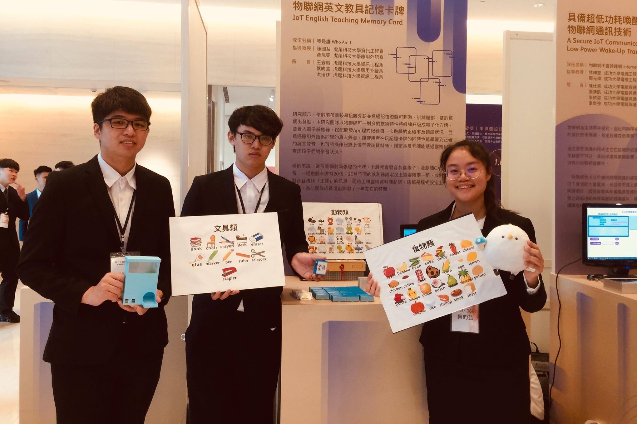由資工系陳國益副教授與應用外語系黃珮雯助理教授帶領跨領域學生王宣融、蔡昀芸、洪瑞廷等同學,以『物聯網英文教具記憶卡牌』獲得應用組銅獎,該作品結合了記憶卡牌和應用外語系同學真人錄音,讓使用者在玩記憶卡牌的同時也能學習到正確的英文發音,並將使用者的操作紀錄上傳至雲端資料庫,使家長及老師可以透過網站即時去查詢孩童目前的學習狀況,是結合IOT與英文教育的優秀實作成品,亦榮獲96,000元獎金。