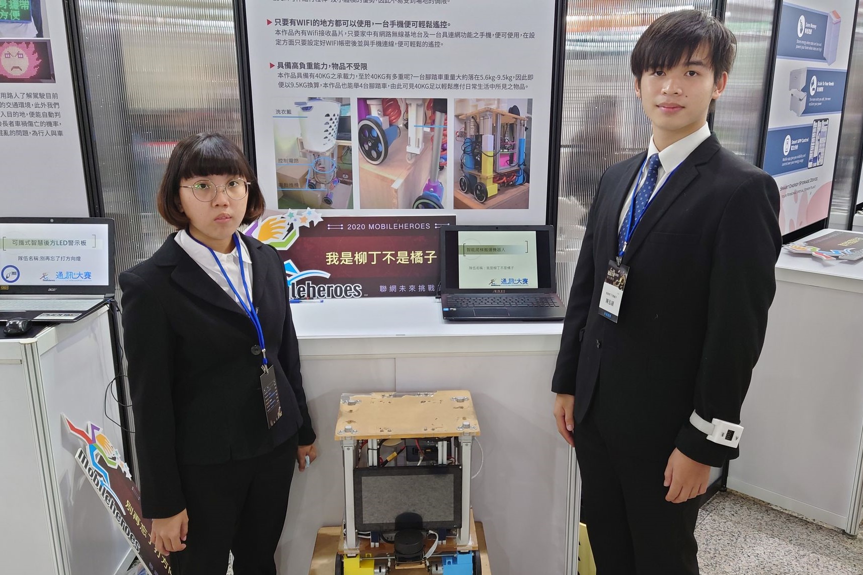作品「智能爬梯搬運機器人」榮獲佳作,該作品由資訊工程系學生陳泓穎、盧德霙所研發,主要目地為改善老人居家安,並降低搬運重物上下樓時發生意外的風險,該作品透過光學雷達(Lidar)即時定位與地圖構建,使機器人具有環境感知性,能夠全自動的移動及避障,應用於各類環境。