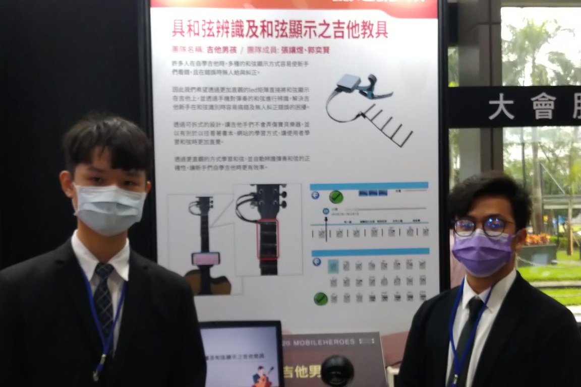 作品「具和弦辨識及和弦顯示之吉他教具」榮獲佳作,該作品由資訊工程系學生張讓煜、郭奕賢所研發,主要為一款吉他輔助學習系統,透過在吉他上增加動態的和弦提示,以及實時的和弦辨識系統,不但能讓使用者快速的學習吉他和弦,配合 APP 學習彈奏歌曲,同時兼顧學習的正確性,讓使用者能夠以更直覺且更有效率的方式來學習吉他。