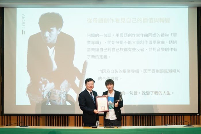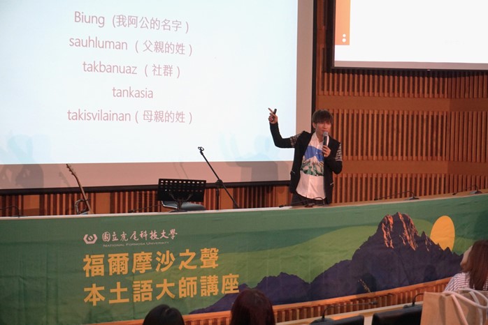 國立虎尾科技大學5/14(三)舉辦「福爾摩沙之聲.本土語大師講座」,邀請金曲獎得主、布農族音樂創作者王宏恩以《Muskun kata 一起我們》為題發表演講。透過生命故事、文化記憶與音樂創作,引領師生認識布農族的生活智慧。現場並以其〈獵前祭槍歌〉、〈思念遙遠的故鄉〉、〈月光〉三首音樂創作,展現本土語言的情感深度與文化厚度。