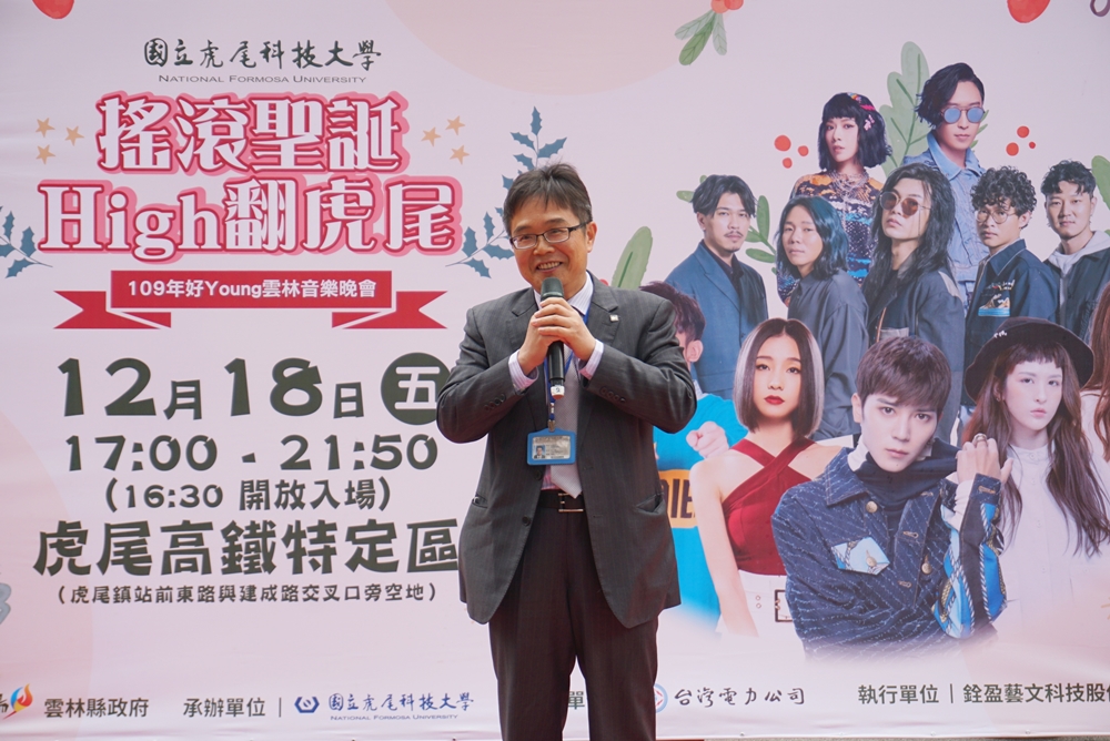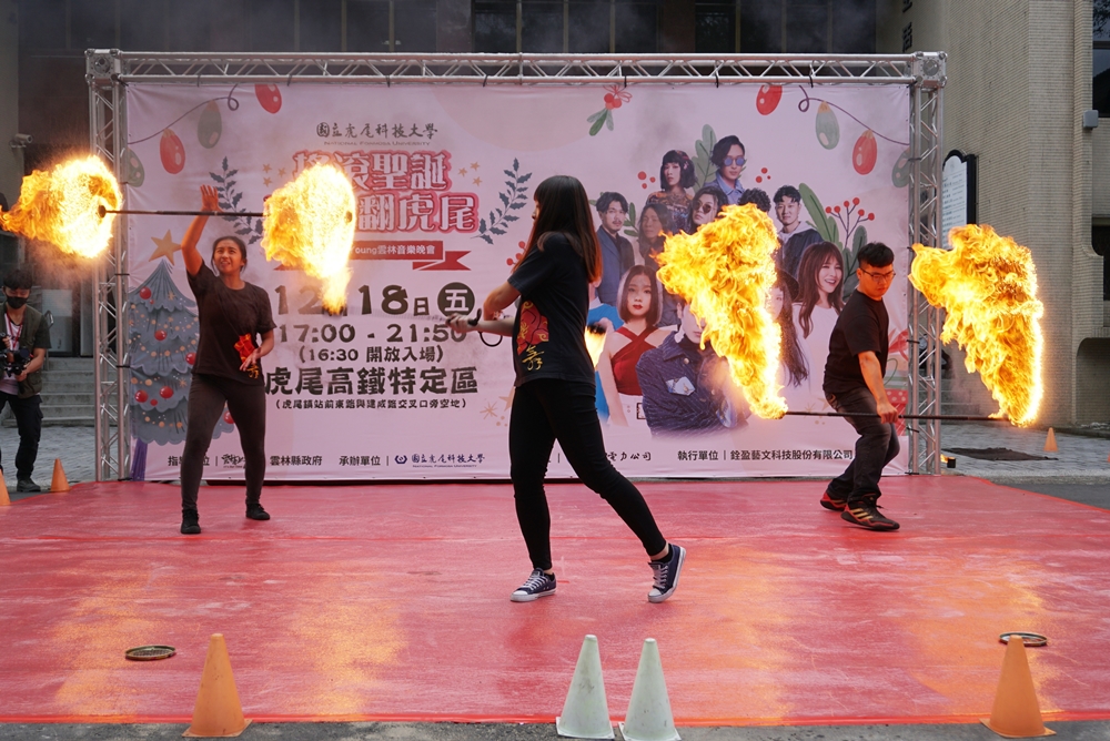 為提升虎尾科大與周邊社區、縣內居民之連結及促進旅外青年回流,本校承接雲林縣政府指導辦理「109年好Young雲林音樂晚會」,將於12月18日在虎尾高鐵特定區盛大登場。今日特別舉行宣傳記者會,由本校炎藝火舞社帶來精彩演出。本次晚會由台灣電力公司贊助,邀請多位重量級藝人,有混血男神畢書盡、美聲天后梁文音、魏如昀、陳忻玥及麋先生、原子邦妮等樂團輪番開唱。現場還有精美禮品及近百項好禮摸彩,讓縣民提前感受聖誕佳節歡樂氛圍。