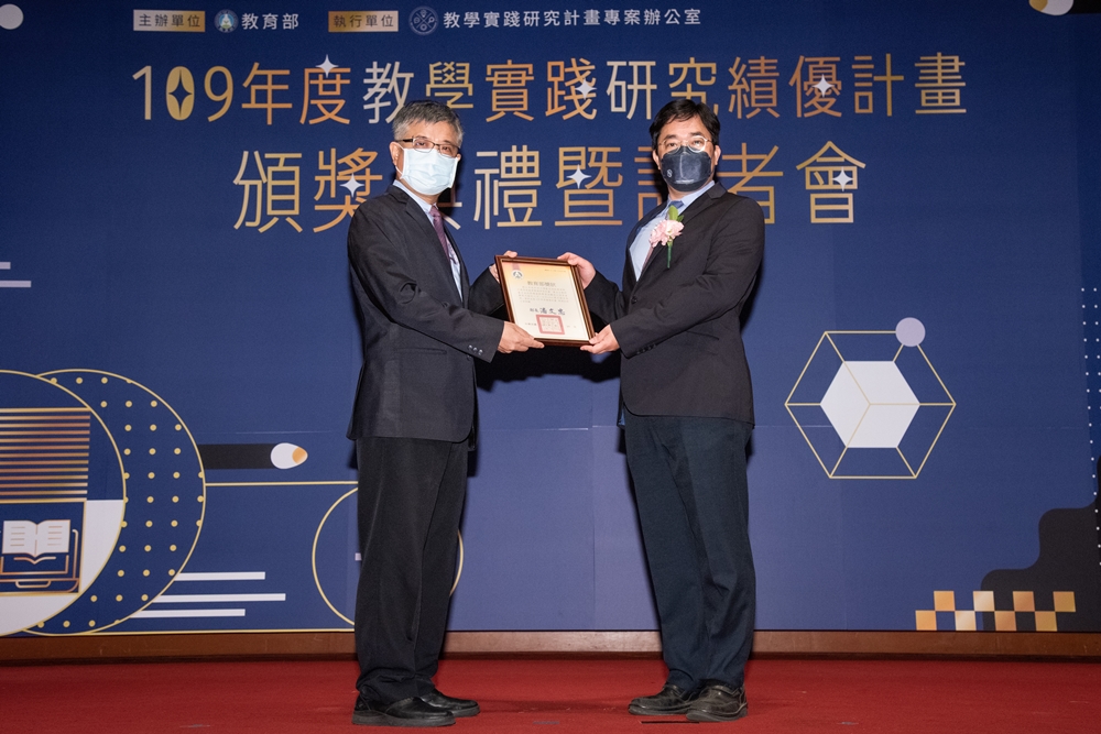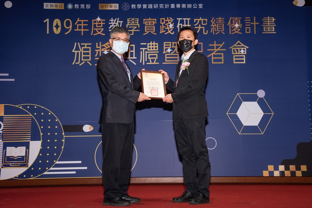 為落實教學創新,強化學校培育人才,教育部推動「教學實踐研究計畫」,並針對成果評選教學模式及研究方法等得以觀摩、具參考價值者,遴選績優計畫。109年度績優計畫名單於今年公布,本校電機工程系教授陳政宏、資訊管理系副教授藍友烽自各學門評比中脫穎而出,並於3/29(二)參與頒獎典禮,該獎項由教育部政務次長劉孟奇頒發。