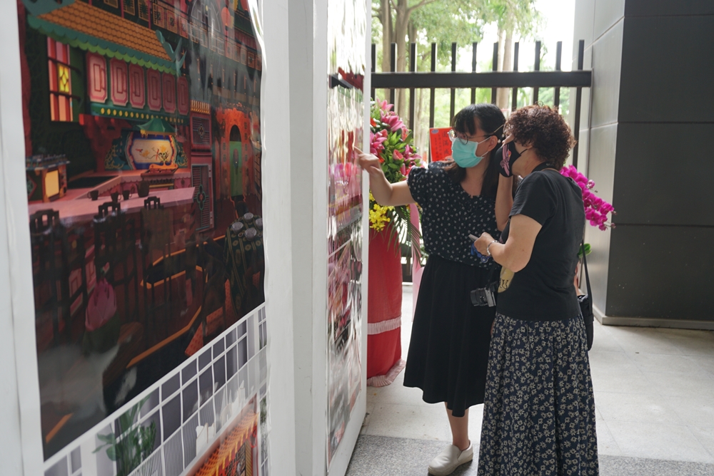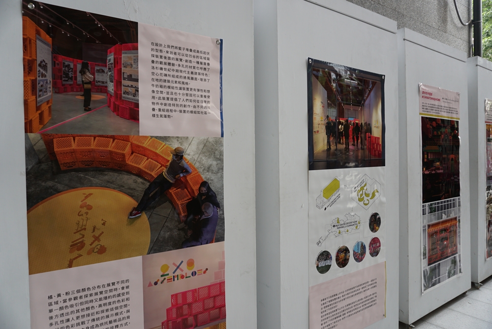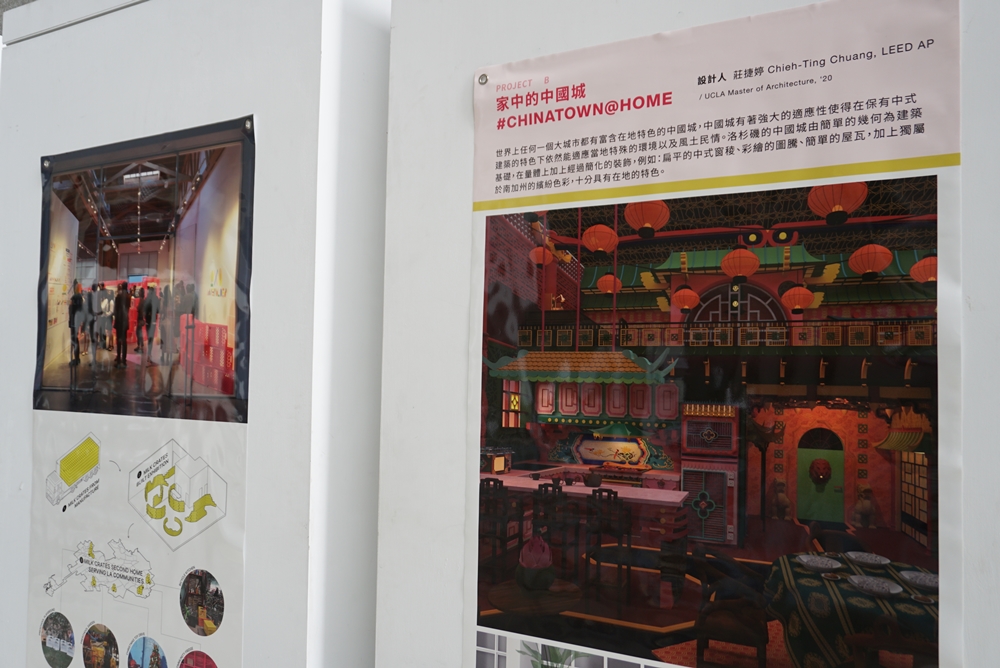 現場以平面海報展出設計師的空間設計,也透過影像呈現作品「穿透城市」於2乘8展覽的360度室內全景實況,讓觀眾可跨越時空,體驗當時的展覽空間;並播放「家中的中國城」建築遊戲影片,將其設計概念運用遊戲方式讓使用者參與設計過程,安排屬於自己「家中的中國城」。